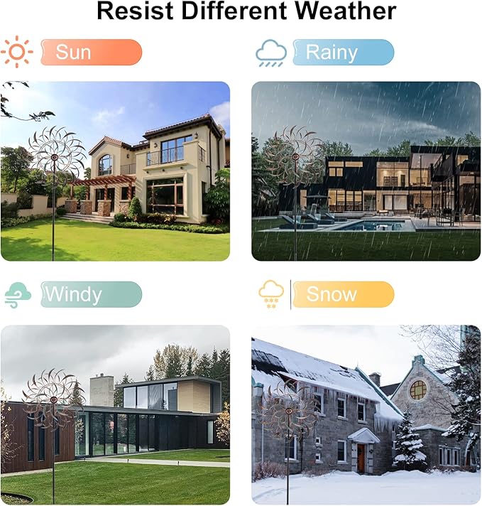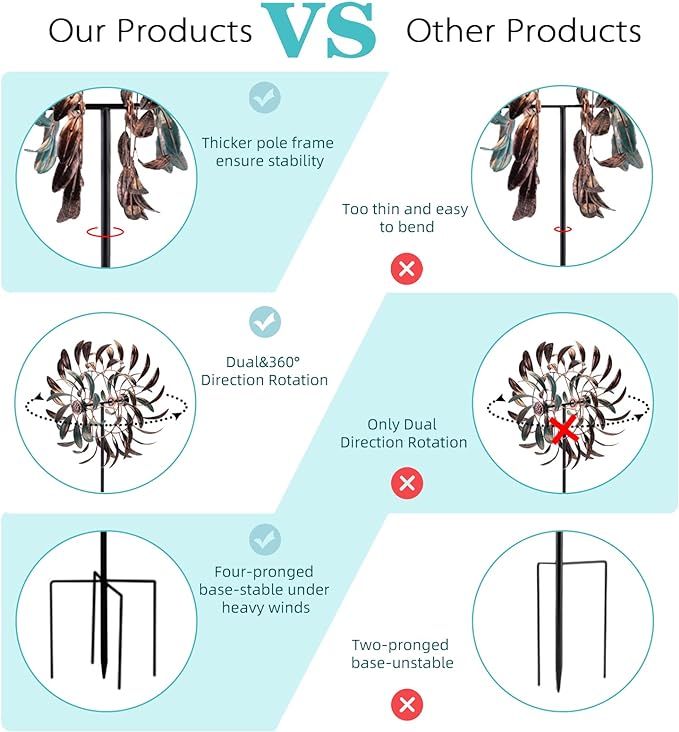 • Flexible Rotate: Metal wind sculptures having double sides blade can spin independently smoothly on sealed bearings, through reversible dual ball bearings, the pair of blades spin in opposite directions simultaneously. Waterproof wind spinner with the durable paint on the blades surface, can withstand most weather conditions