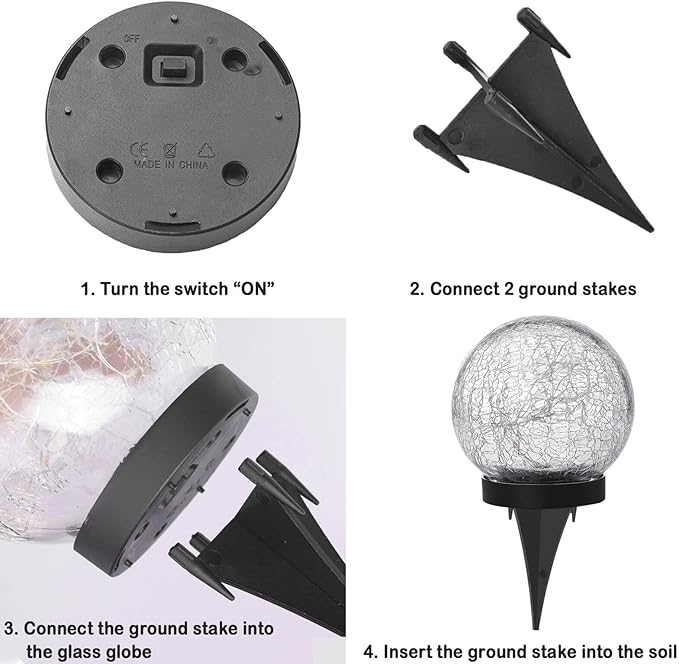 • CRACKED GLASS SOLAR LIGHTS: 2 pack Globes Solar Garden Lights are made of high qualityABS+ thick cracked glass. Solar ground lights will automatically turn on at night and turn off during the day. Solar lights outdoor waterproof decorative can create a romantic night environment for you.