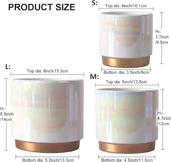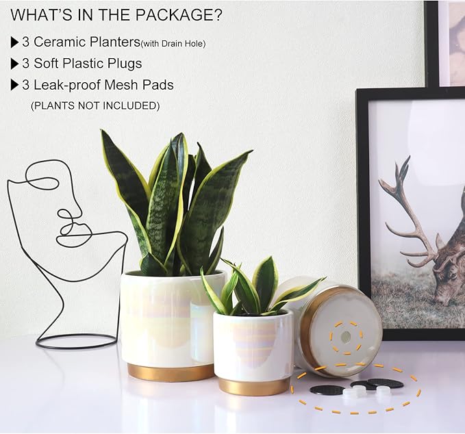 • Size & Package: 6.0 Inch Pot + 5.0 Inch Pot + 4.0 Inch Pot. Package: contains 3 ceramic flower pots, 3pcs mesh pads and 3pcs rubber stopper (NOT INCLUDE PLANTS)