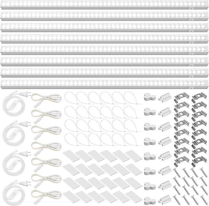 • What You Get: 8 x Barrina T5 Grow lights, 4 x Power Cords with ON/OFF Switch, 7 x Connecting Cords, 8 x Small Connectors, 16 x Installation Clips, 24 x Double-sided Tapes, 24 x cable ties