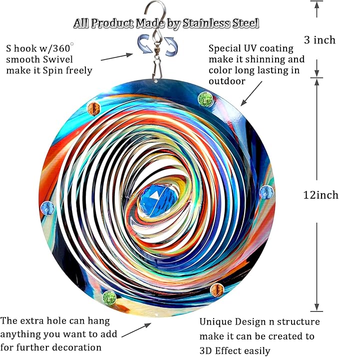 • Vivid reflective color】wind spinners are individually hand painted by epoxy protective coating with colorful sparkle powder inside to highly resist weather and rust. -Meanwhile,the reflective colorful glitter material gives off a sparkling, captivating and magical 3D visual effect, its beautiful light reflecting and attractive view whatever in night or day, wherever room or garden.