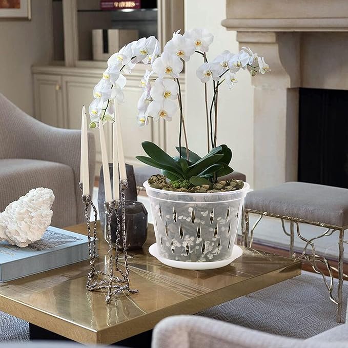 • Clear Orchid Pots: Transparent material makes it easy to observe the condition of the roots. It also comes with a saucer so your floor or desk won’t get ruined