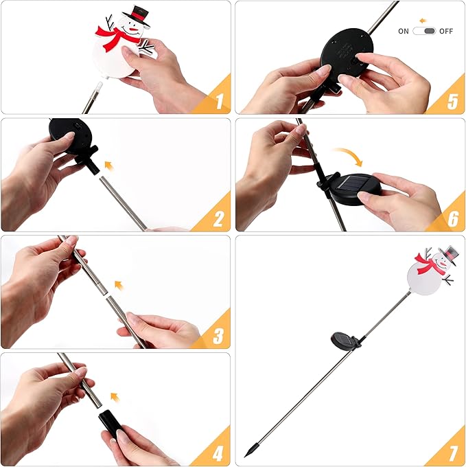 • ASSEMBLE EASILY: Complete with detailed instructions. These solar Xmas pathway makers can be done in a few minutes. Just connect the stainless steel parts and stake into the soft ground where there has direct sunlight. In stormy weather, please keep the solar lights indoor to avoid damaging the solar panels