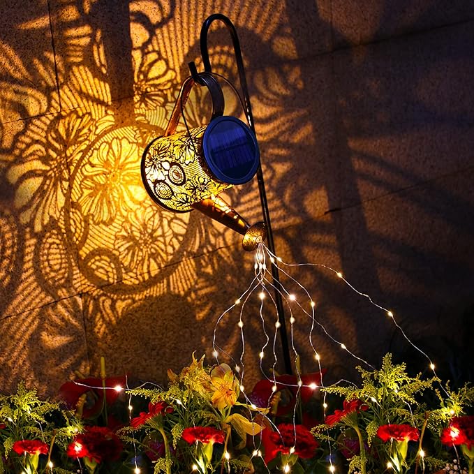 • Solar Watering Can With Lights -- VOOKRY Solar Garden Lights(with Shepherd Hook) comes with 5 LED String Lights (50 LEDs), The light wire is 3.28 feet long, which can be easily bent and shaped into any shape you like, perfect for DIY. Turn on the light at night and it will present a vivid and beautiful retro hollow pattern. Decorate your watering plants, vines, potted plants, porches, paths, patios and more, the perfect addition to your garden decor.