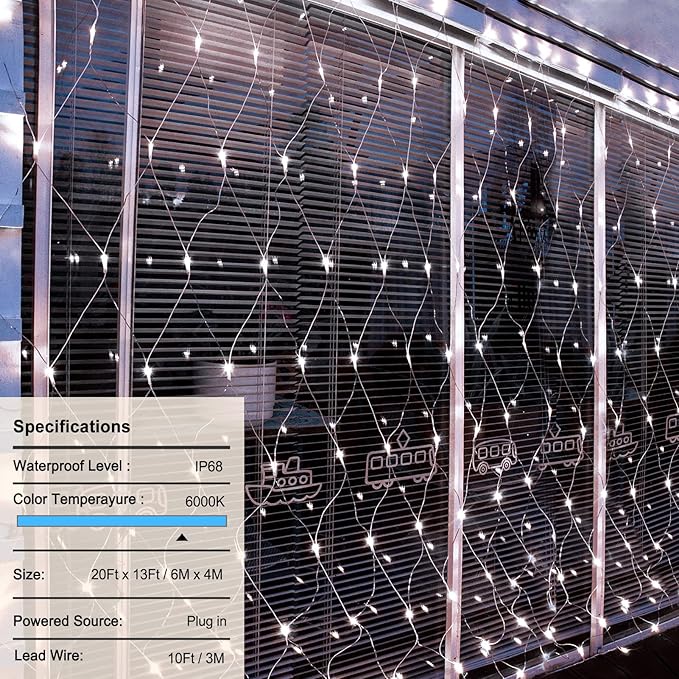 • Fully Waterproof: Net string lights is IP68 fully waterproof, which can be used normally even in bad weather outdoors. (note: the adapter is not waterproof, it needs waterproof treatment for outdoor use)