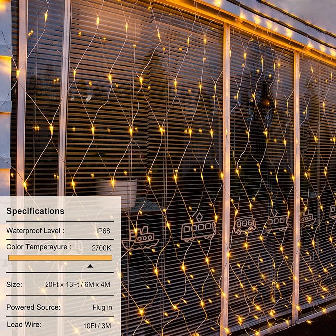 • Fully Waterproof: net string lights is IP68 fully waterproof, which can be used normally even in bad weather outdoors. (note: the adapter is not waterproof, it needs waterproof treatment for outdoor use)