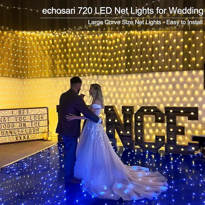 • echosari Large net lights with dimensions of 20ft x 13ft, featuring 720 LEDs on a clear wire mesh. Designed to provide bright and even illumination, ideal for creating a stunning decorative effect