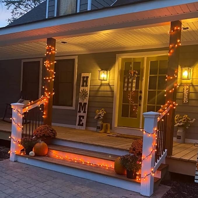 • Outdoor Christmas Decor Solar String Lights: 100 LED starry-style string lights with orange lights accent your space with a unique, inviting glow. 33ft length is perfect to put around a garden or porch railing. In the dark, the wire fades to invisible, leaving only the fairy lights, create a classy and romantic atmosphere.