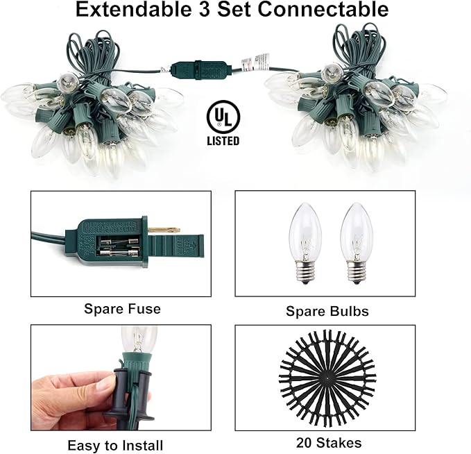 • Warm White Bulbs:This C9 Christmas Path Light Bulb is Detachable And Easy To Install Or Replace. Each Bulb Is 7 Watts, 120v. Suitable For E17 Base. This Walkway Lights With 20 Stakes Comes With A Spare Bulb X2 And A Spare Fuse In The Male Plug