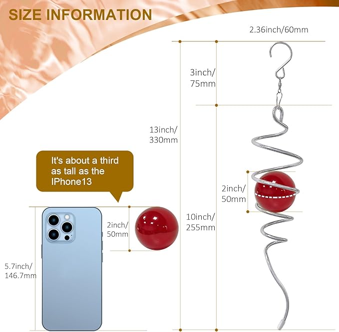 • 【 Enjoy Magic Visual Illusion 】​This beautifully clever yet simple gazing ball spiral tail is designed to create a stunning optical illusion. The glass ball appears to float and dance in the air as the magic glass ball spiral tail spins, creating a magical visual illusion that has a calming and relaxing effect on the mind. The Spiral Tail Wind Spinners can reduce anxiety and improve mental focus, making it perfect for creating a relaxing atmosphere in your home, garden or yard.