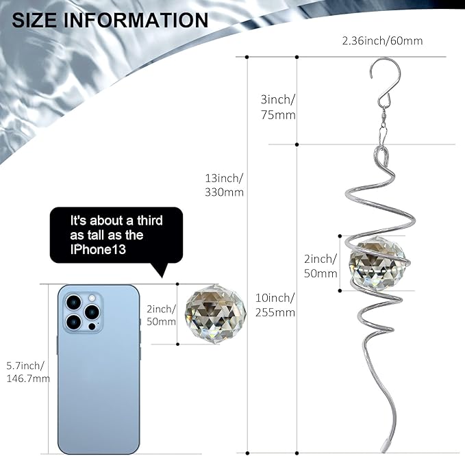 • 【 Cleverly Designed Spiral Tail 】When the Gazing Ball Spiral Tail spins, it has a magical hypnotic kind of effect. This crystal ball gives the illusion of moving up or down on a spiral tail. Gazing Ball Spiral is also a special crystal sun catcher rainbow maker. This spiral tail suncatcher captures rays of light, creating a cheerful light-scattering effect. Perfect for creating a relaxing atmosphere in your home, garden, patio or yard.​