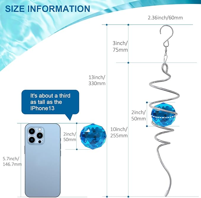 • 【 High Quality Gazing Ball Spiral Tail 】Eiryhope's 13 inch height stainless steel gazing ball spiral tail is made of high quality stainless steel spiral wire and top crystal material, with an 11 inch spiral tail and a 2 inch solid K9 crystal glass ball. Finely crafted, the crystal balls are highly clear and cast stunning rainbows that transform sunlight into a beautiful array of colors. The fabulous crystal ball adds a touch of glamour to this crystal tail spinner.