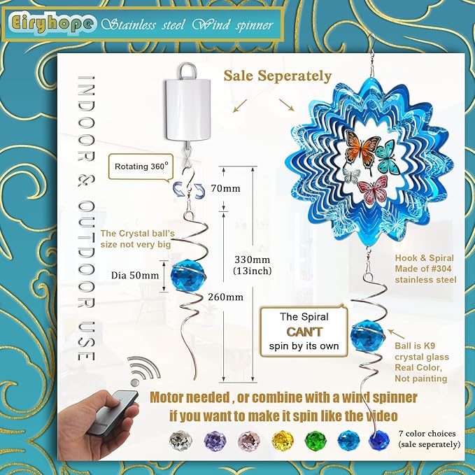 • 【 3D Wind Spinners Stabilizer 】The wind spinner spiral with a 360° swivel hook is easy to hang. Our wind spinner crystal tails are gorgeous additions to our range of 3D wind spinner accessories. Attached to the bottom of kinetic wind spinner, which adds another dimension to the overall look, also helps provide stability on windy days. Since the Wind Spinner Stabilizer Spiral Tail can't spin on its own, add a wind spinner motor (not included) to help it spin.