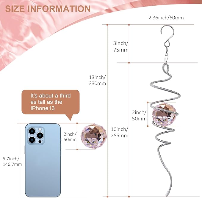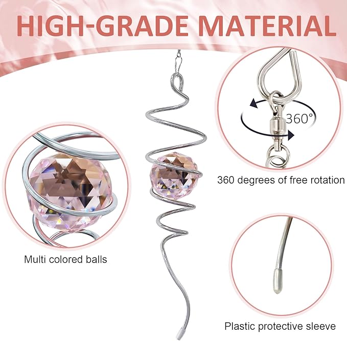 • 【 Meaningful Unique Gifts 】Pink Crystal symbolizes love and happiness. The Gazing Ball Spiral Tail Wind Spinner came in a beautiful gift box that was easily giftable. This magic ball spiral tail is a wonderful gift that will be a hit as a birthday gift, Thanksgiving gift, Christmas gift, housewarming gift, garden gift, Decor gift, etc.. The wind spiral with crystal ball is a perfect gift for birthdays, Thanksgiving Day, Christmas, etc. and any you loved people ( family, friend, etc.).