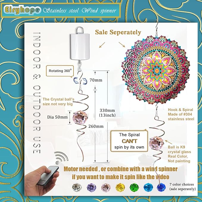 • 【 3D Wind Spinners Stabilizer 】The wind spinner spiral with a 360° swivel hook is easy to hang. Our wind spinner crystal tails are gorgeous additions to our range of 3D wind spinner accessories. Attached to the bottom of kinetic wind spinner, which adds another dimension to the overall look, also helps provide stability on windy days. Since the Wind Spinner Stabilizer Spiral Tail can't spin on its own, add a wind spinner motor (not included) to help it spin.
