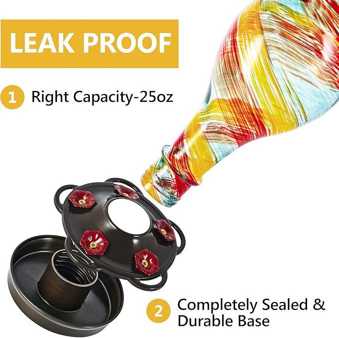 • LEAK PROOF: This vintage glass hummingbird feeder features a convenient 25 fluid ounces capacity, a slender shape and a completely sealed base that has the least leaking, drips and spills.