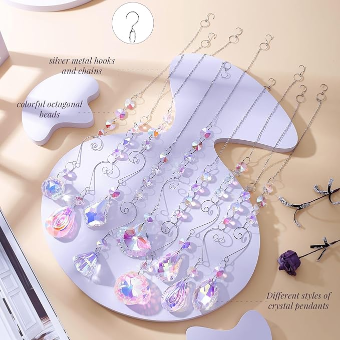• SET OF 9 CRYSTAL SUNCATCHERS: Exquisitely handicrafts, made of crystals glass. Total length: around 15.75 inches. Top with silver metal hook and chain for easy hanging, colored glass octagonal beads in the middle, and tail with crystal pendants with different shapes such as crystal balls