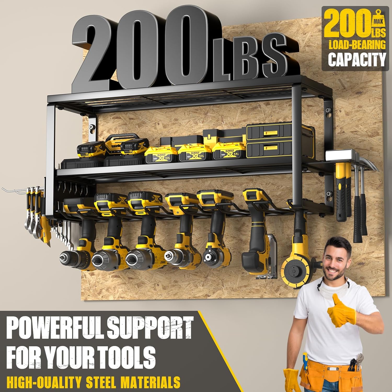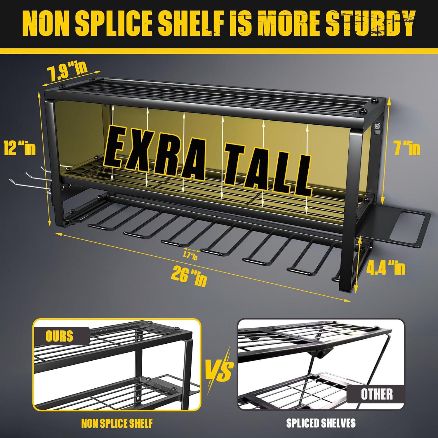 • 【HEAVY DUTY】:This tool shelf is made of heavy compact steel metal, and the joint of the shelf uses a reinforced design. With plenty of load-bearing testing, our tool storage rack can hold your power tools of any weight