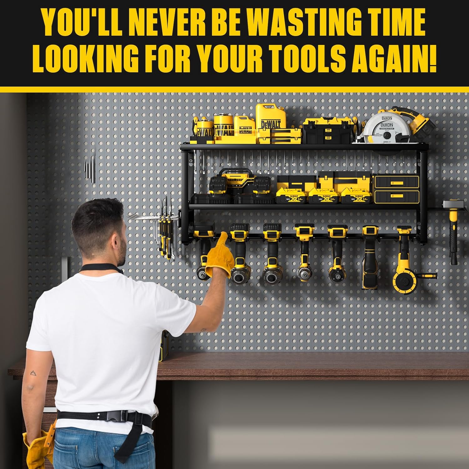 • 【LARGE SIZE】:Our power tool organizer has upgrade 7-slot cordless drill holder with three-layer design and double side hanger. Huge space means you can keep all of your tools organized in one central location and you'll never be wasting time looking for your tools again!