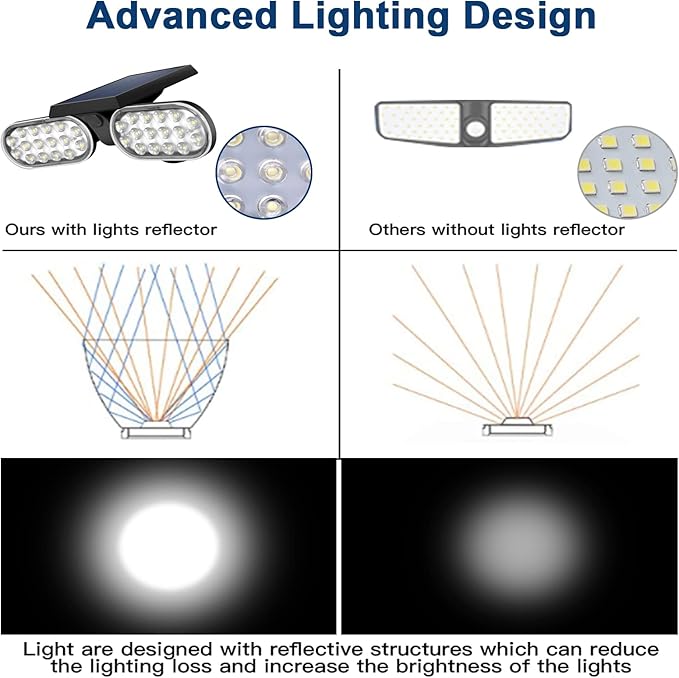 • << Double Heads 210° Adjustable >> Double heads design of our solar Spot Lights, the lighting area is larger, 210°adjustable no wires to run multicolored solar spotlight, Zero electricity bill.