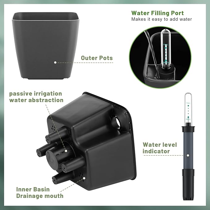 • GS Garden self-watering planters is an ideal plant pot for for All Outdoor/Indoor plants. The special water inlet design can avoid soil collapse and lead to excessive hardening of the flower soil. The root system can fully grow in the soft soil.Ideal for residential and commercial grades