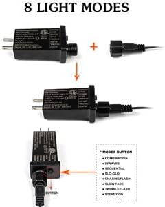 • Convenient Timer Function & 8 Modes & Memory Function: The button is at the end of the plug to turn on/off the timer function, press the button for few seconds till the green light on/off to turn on/off the timer function and switch 8 modes (combination, in waves, sequential, slo glo, chasing/flash, slow fade, twinkle/flash, steady on). This fairy lights could remember the setting of previous night you set.