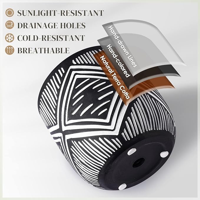 • 【Minimal Modern Appeal】Classic black 6 inch indoor plant pot surface decorated with bohemian white hand-drawn sculpted lines makes for an casual styles. Match your home decoration such as modern,contemporary,minimalist,mid century,bohemian,shabby chic style, etc.