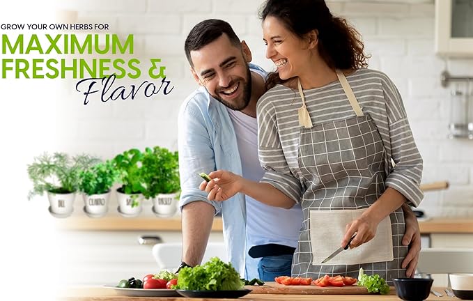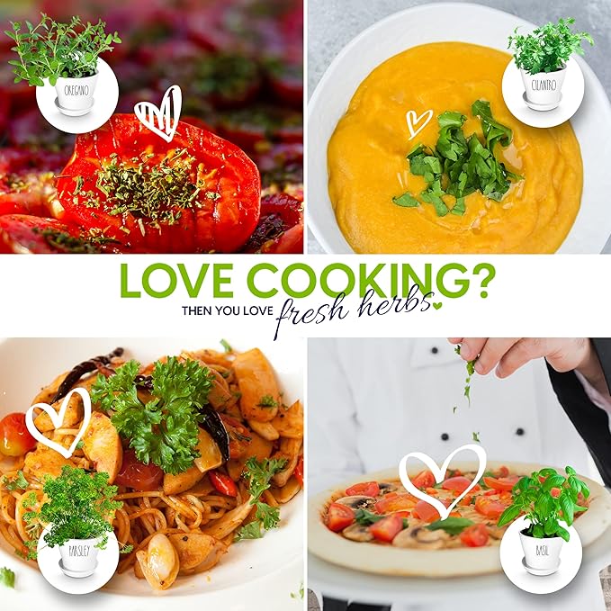 • Equipment & Accessories - This kit includes everything with nothing else to buy. You get 8 pots, 8 saucers to collect runoff, 8 expanding soil discs, and 1 kelp nutrition pack. We also include 8 transparent herb labels so you always know which pot holds which plant. Labels are printed in charming large Rae Dunn font to take the place of the usual stakes. These will look cute in your kitchen.