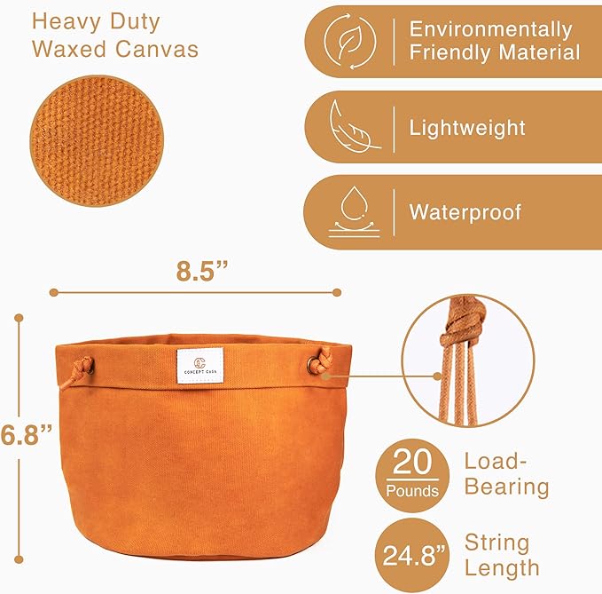 • Its carefully crafted waxed canvas material comes fastened with 3 flexible, weight-bearing ropes to hold your indoor plants in place and keep your plant pot in shape. The ropes of our hanging planter measure 24” in length, giving you enough length to work with. Shorten or lengthen by readjusting the knots to your desired height and voila!