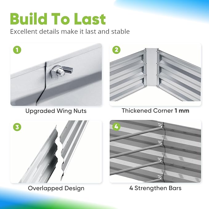 • 【Built To Last】Raised garden box is made of powdered coating galvanized steel panel, assure fine condition of the metal garden bed, it's able to stand harsh weather conditions, won't crack in years. Contact us for any question, 5 year service for raised garden bed parts, you can use without any concern.