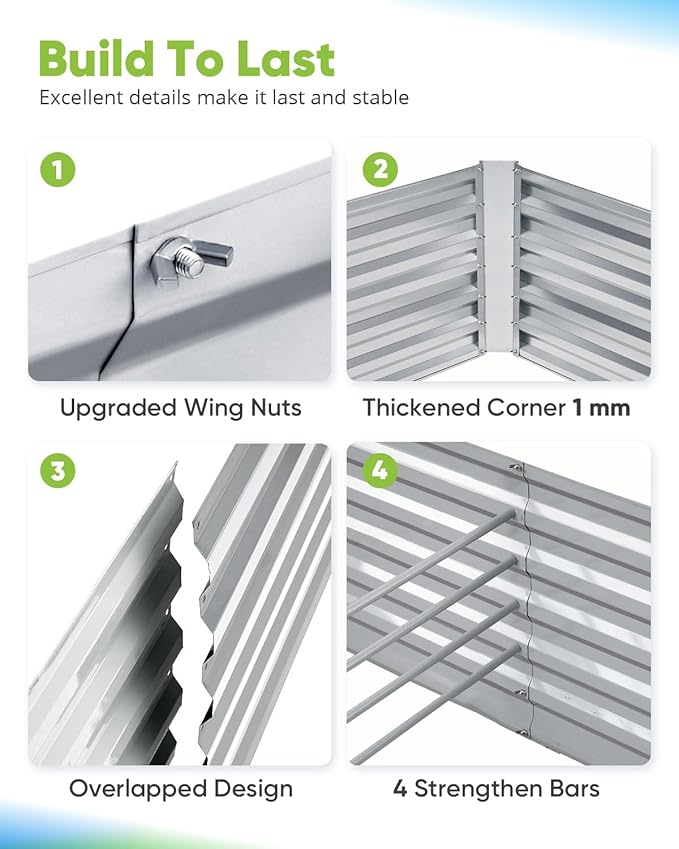 • 【Built To Last】Raised garden box is made of powdered coating galvanized steel panel, assure fine condition of the metal garden bed, it's able to stand harsh weather conditions, won't crack in years, use without worry.