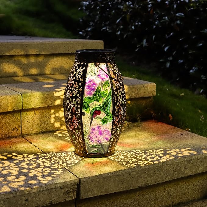 • 【Unique Glass Solar Lantern 】Hanging solar lantern feature a exquisite cardinal pattern, the vintage appearance will be unique addition for your garden or tabletop,and creating warm illuminated charm.