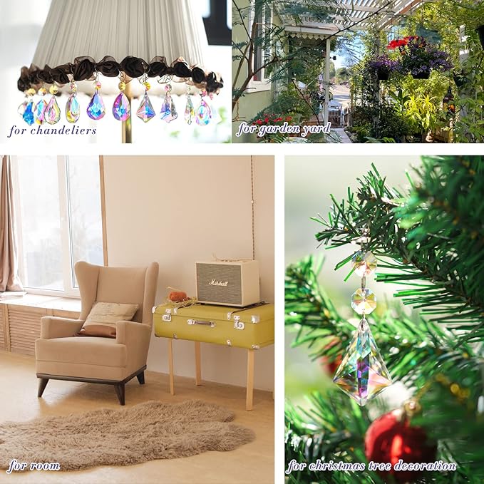 • Colorful Crystal Suncatcher Hanging Prisms: 12 pcs various shape k9 Crystal Chandelier Prisms, each crystal prism include 1 pc prism pendant connected 1 pc 0.55”/14 mm glass bead with stainless jump ring and small hook. Great for feng shui, Car Charm, Chandelier Decoration, Home Decoration, Wedding DIY Ornament, cast the beautiful rainbows, add your room more colorful