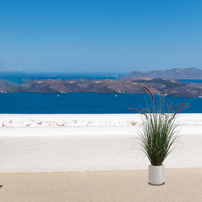• 1.This faux plant features close to natural green grass with 10 Purple silk flowers, all inside a durable and solid flowerpot. Artificial Setaria grass is 47 inches high.base with a black plastic pot in 5'' dia ,5.9''high.it’s easy to put it in a nice bigger planter as desired.