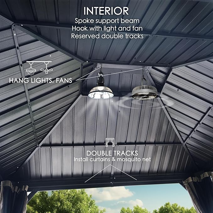 • ✅Metal Canopy/Roof and Gutter Design - The metal canopy of this gazebo ensures longevity and durability. Its roof, made of sheet metal, boasts a robust 29-gauge thickness, which is thicker than most gazebos on the market. its water gutter system ensures that rainwater is efficiently directed away from the edges of the frame and poles.