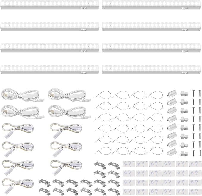 • What You Get: 8 x Barrina T5 Grow Lights, 4 x Power Cords with ON/OFF Switch, 7 x Connecting Cords(20''), 8 x Small Connectors, 16 x Installation Clips, 24 x Double-sided Tapes, 24 x Cable Ties