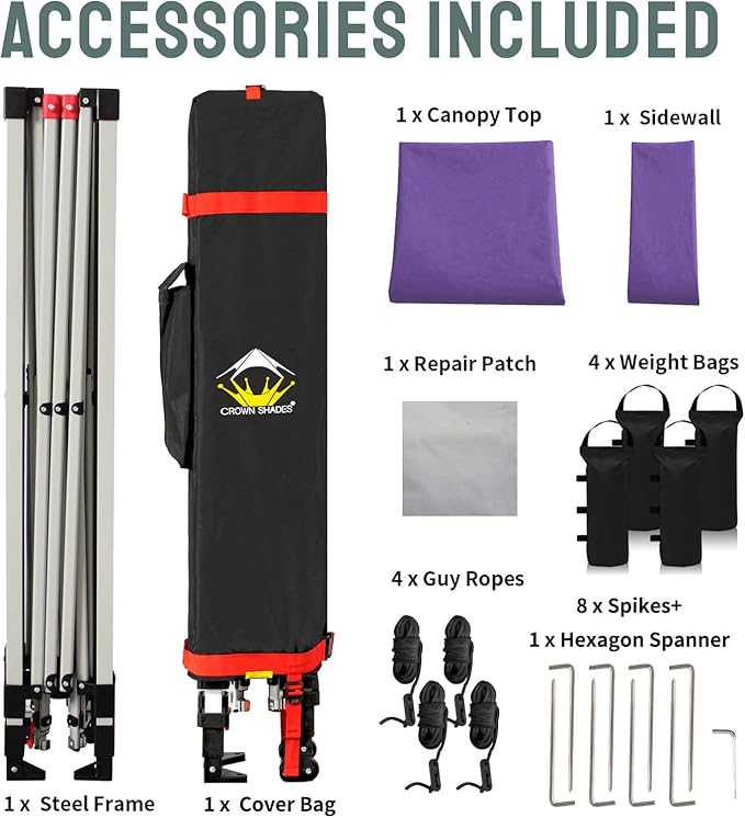 CROWN SHADES 10x10 Pop Up Canopy with 1 Side Wall - Beach Tent with One Push Setup - Outdoor Sun Shade for Events, Parties, Camping - Gazebo with STO-N-Go Cover Bag (Purple)