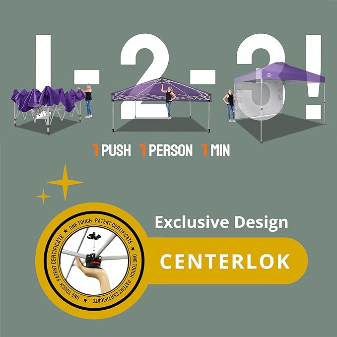 • ONE BUTTON EASY SET UP - Our 10x10 pop up canopy tent features patented one push center lock tech. With just a single push, the central hub locks the poles in place. Designed for the next generation, this outdoor canopy for patio can be set up by two people in seconds without any tools. Three adjustable height settings with soft, pinch-free buttons ensure convenience and safety, making it perfect for camping, beach outings, craft fairs, tailgating, farmer markets, outdoor BBQs, and more