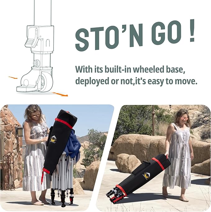 • STO’ N GO SYSTEM - Our lift-free system makes collapsing, storing, and transporting the 10x10 tent a breeze. The 10x10 tents can be stored with the fabric attached, with a specialized pocket for 4 sandbags, 8 stakes, and 4 guy ropes. Integrated wheels in the feet allow easy movement even when the instant shelter tent is set up, by simply lifting the side without wheels. This feature is especially useful for quick setup and takedown at locations like the patio or sports events