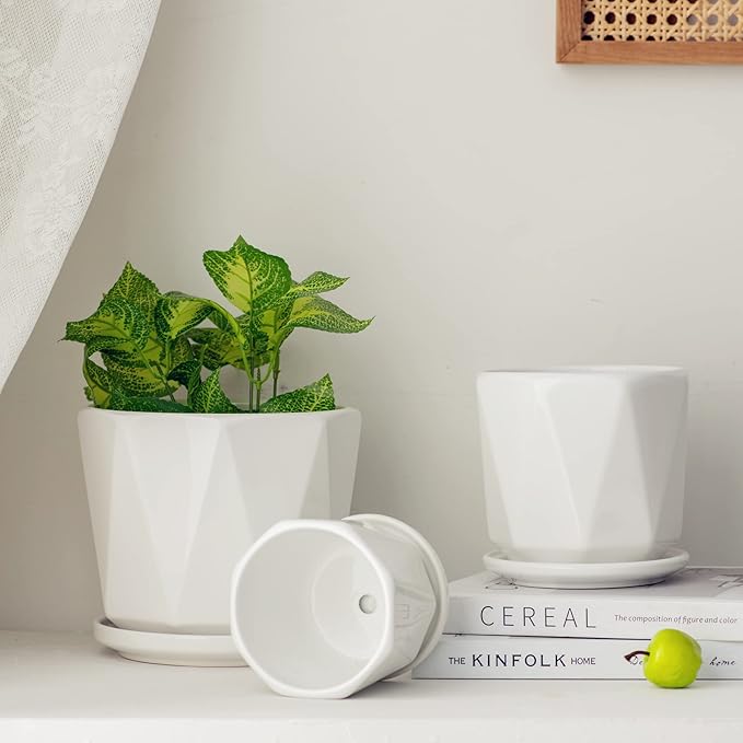 Octagon Ceramic Plant Pots - Indoor White Flower Planter Set with Drainage Holes, 6.7/5.5/4.7 Inch, Modern Decorative Planter Outdoor for Succulents Snakes and Herb