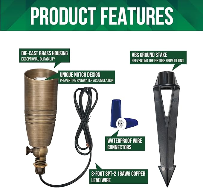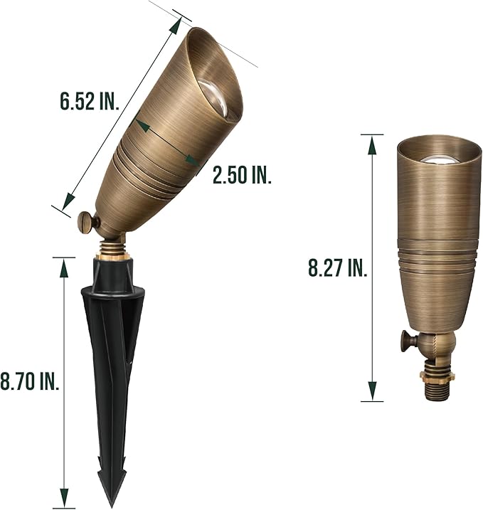 • Die-cast brass construction: This landscape spotlight is crafted from solid brass for durability and an elegant look. As it ages, a natural patina will develop, seamlessly integrating the lights into your landscape design.