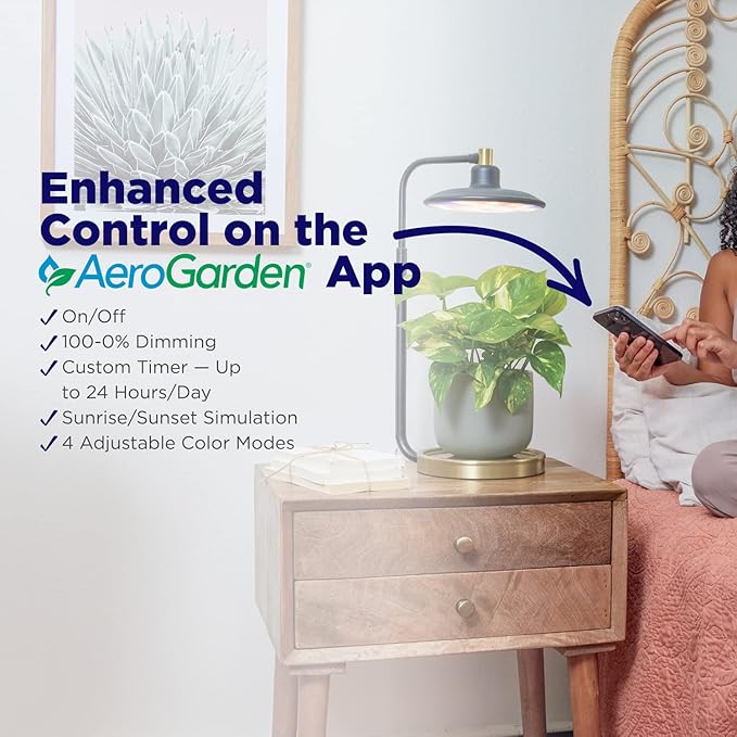 • Easily customize your smart grow light via the AeroGarden app, with features including custom light schedule, dimming capabilities, sunrise/sunset setting, and four adjustable Light Modes