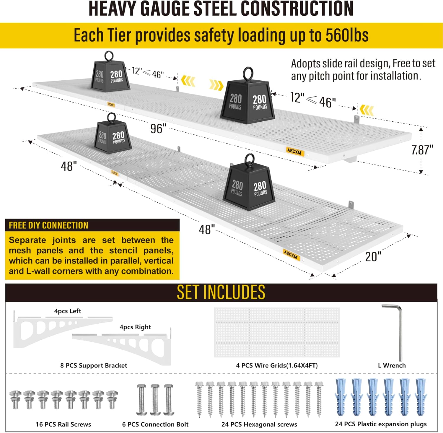 • Innovative Design: Unlike fixed wood stud spacing systems, Aecxm garage wall shelving feature an exclusive sliding rail screw design, allowing flexible installation on any wood stud spacing within the panel's length. Adjust freely and hassle-free