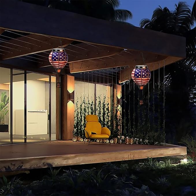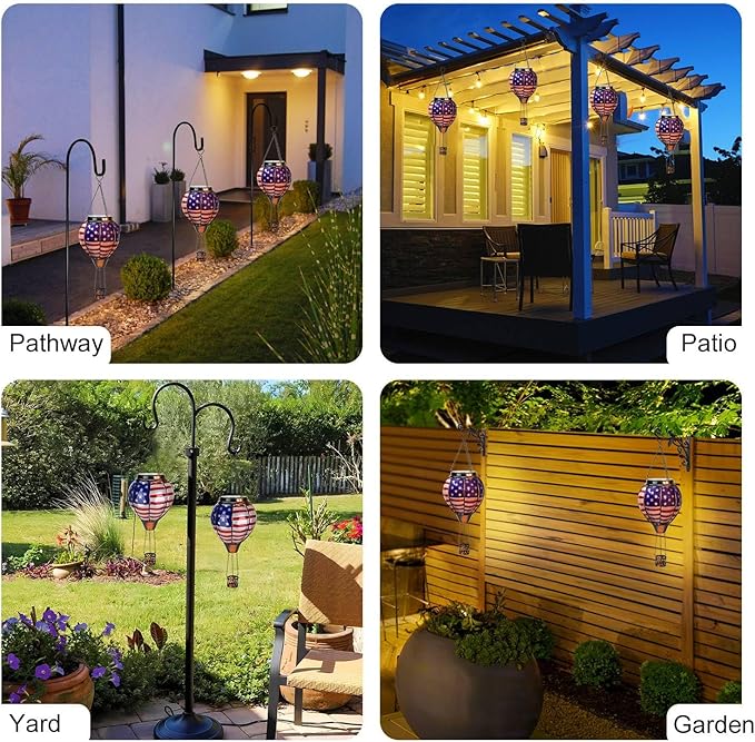 • 【Unique Hot Air Balloon Design】--This hanging solar light is composed of 8 pieces of flag glass with lifelike flame lights. As night falls, their glow adds warmth and comfort to your garden, patio, yard, path, and more: July 4th Independence Day decoration, great Christmas decorative lights.