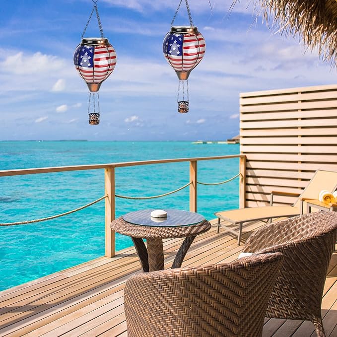 pearlstar Hot Air Balloon Solar Lantern with Flickering Flame Light Outdoor 4th of July Decorations Solar Hanging Lights Waterproof for Garden Yard Patio Outside Independence Day Decoration, Flag