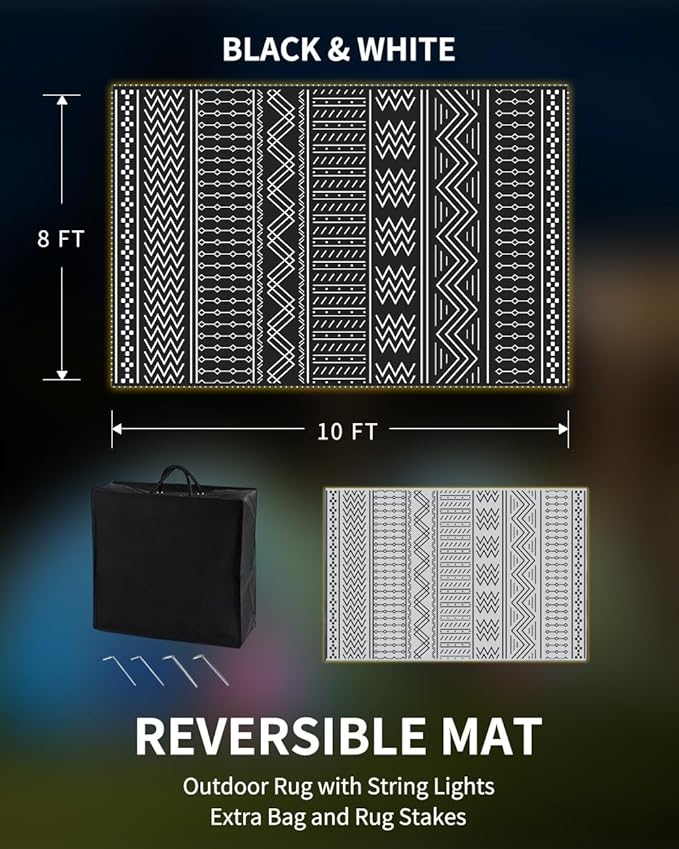 • Lightweight & Portable: Lightweight material and folding lines enables you to fold and pack this large outdoor rug into the carrier bag for other uses, such as camper rug, beach rug, outdoor rv rugs for under awning. Convenient tie-down lanyards and rug stakes ensure you securely stake the rug in place outdoors.