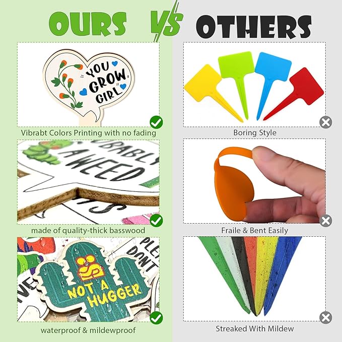 • 🌿Sturdy & Durable: The plant labels for outdoor garden waterproof are made of high-quality wood, which is sturdy and durable, with high-quality printing, not easy to fade, and can stand the test of time. The T-shaped garden marker design, the garden labels bottom is pointed, you can easily insert it into the flower pot. Compared with plastic plant stakes, it is more environmentally friendly, does not contain harmful substances, will not pollute the soil and harm plants.