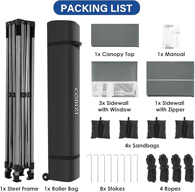 • 【Packing List】1x 10x10 Commercial Pop-up Canopy Frame, 1x 10x10 Canopy Top Cover, 4x PU coated Panels (3x SideWalls with Window and 1x SideWalls with Zipper), 4x 420D Oxford cloth PVC coated Sandbags, 8x Ground Pegs, 4x Wind Ropes, 1x Wheeled Bag, 1x Manual. We provide you with the best service, if you have any questions and doubts, please feel free to contact us. Choosing us will be a right decision