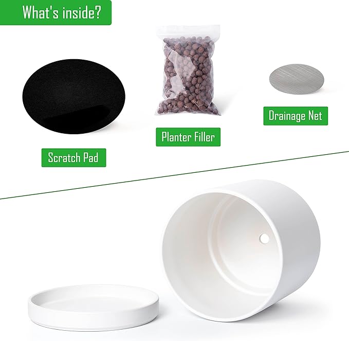 • Planter pot with drainage hole, mesh drainage net and protective scratch pad included.