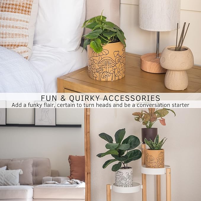 • Mushroom Planter with whimsical etched design all around. Fun and eclectic decoration sure to make a cottagecore statement. Holds small indoor plants, fresh flowers, and succulents
